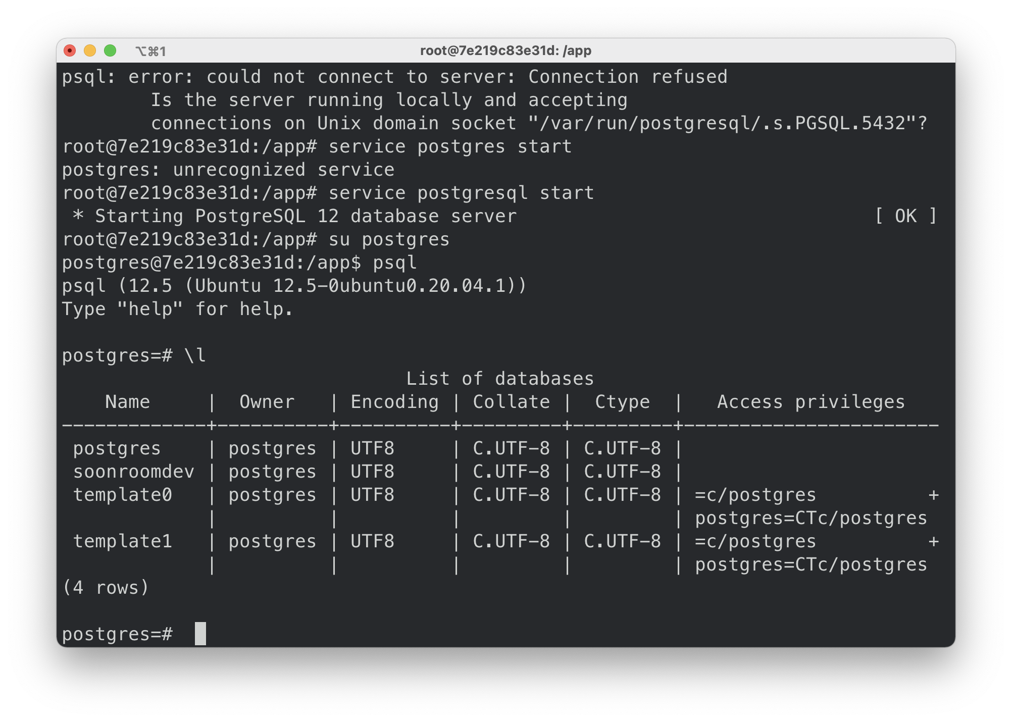 그런데 문제가 생겼다. 굳이 이렇게 Ubuntu 이미지를 생성할 필요 없이, 로컬에서 node 도커와 postgre 도커를 돌리면 되는 것이었다. Ubuntu 이미지 만들면서 공부는 제대로 했지만.. 고생을 좀 한 것 같다.