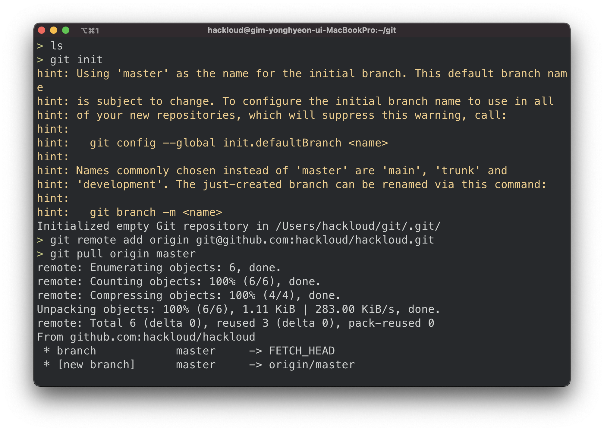 - git pull origin master를 톨해 현재 로컬 master 브랜치에 원격 origin/master 브랜치의 내용을 pull해온다.
